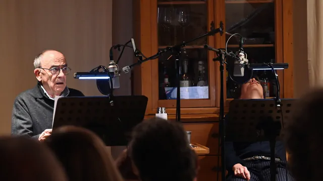 Bild 8 von 11. Verwandelten das Wohnzimmer von Monika und Peter Kuyper in ein Hörspielstudio (v.l.n.r.): Päivi Stalder, Peter Fischli, Franziska von Fischer, Patrik Arnold, Johannes Mayr, Christian Riesen. Auf dem Bild fehlen die Fotografen Janis Schweizer sowie Ellen Chioru. Bildquelle: SRF / Janis Schweizer.