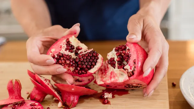 Wer schon einmal selber von Hand einen Granatapfel entkernt hat, weiss: Die Sauerei ist vorprogrammiert. Die filigrane Haut der Kerne platzt auf, wenn man nicht ganz vorsichtig ist, und der rote Fruchtsaft hinterlässt überall Spritzer. Es gibt zwar diverse Tricks, wie die Angelegenheit halbwegs sauber gelingt, dennoch bleibt es eine mühsame Angelegenheit.