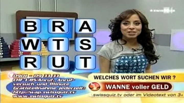 Romy Oppliger hat weitere Belege dafür, dass es bei diesem Spiel mit den seltsamen Anrufern und den falschen Antworten nicht mit rechten Dingen zugeht. Das Spiel heisst «eine Wanne voller Geld». Die Moderatorin ermuntert die Zuschauer permanent, aus neun Buchstaben ein Wort zu bilden. Auf den ersten Blick ist klar: «Bratwurst» ist die richtige Lösung. In der Geldwanne mit dem Gewinn liegen mittlerweile mehrere Tausend Franken.