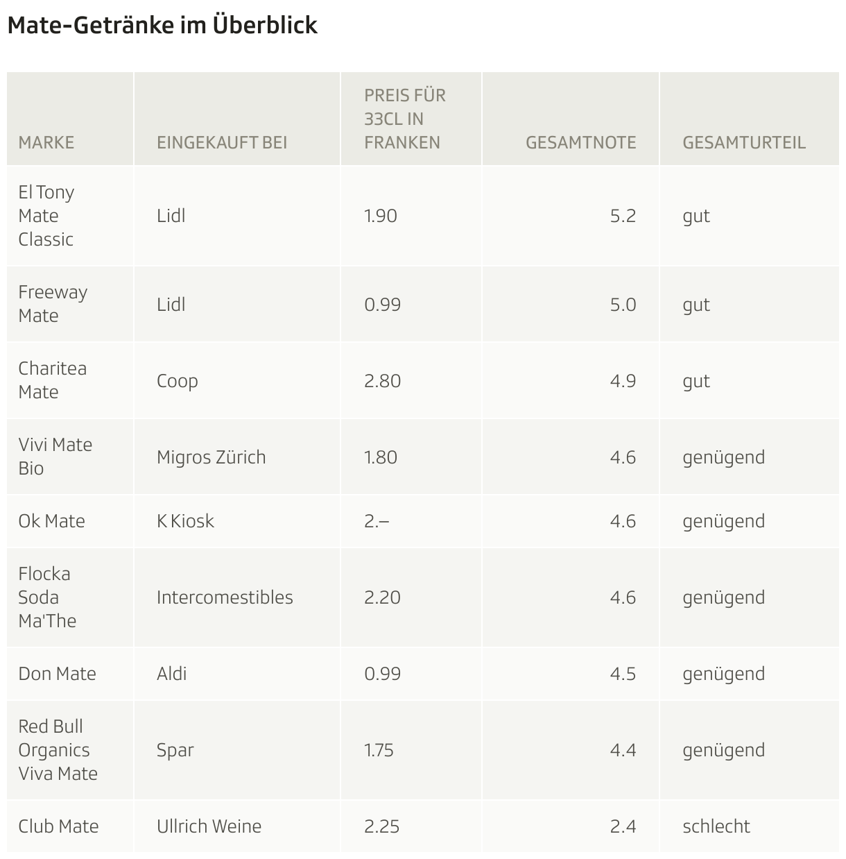 Im unteren Mittelfeld findet sich mit der Note 4.4 Viva Mate von Red Bull wieder. Vielen ist das Getränk des österreichischen Energydrink-Herstellers zu süss. Im Gegensatz zur traditionellen Machart von Mate-Tee sind im Test alle Produkte gesüsst.