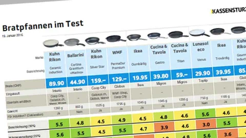 Von zwölf Bratpfannen im Test schnitten vier mit einem «guten» Gesamturteil ab. Die beiden teuersten Bratpfannen (159 und 129 Franken) belegten die Ränge drei und vier. Der Testsieger kostet knapp 90 Franken, die nur wenig schlechter bewertete Pfanne auf dem zweiten Platz ist mit 44.90 Franken noch günstiger. Die Tabelle (rechts in der Box) gibt einen Überblick über die Resultate.