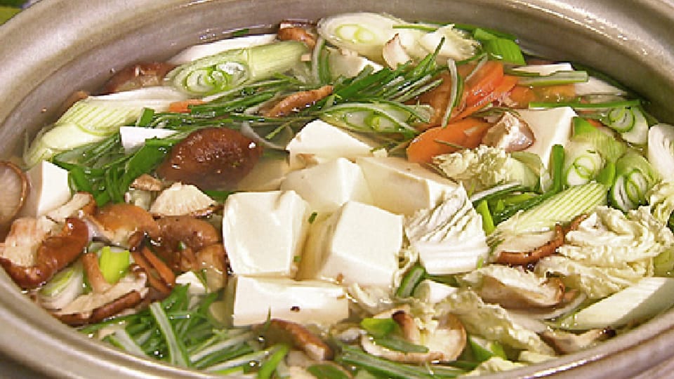 Tofu und Gemüse nacheinander aus dem Topf nehmen und mit dem Rettich essen.