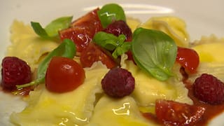 Alle Zutaten der Masse beigeben, kurz aufkochen. Mit Tomaten, Himbeeren und Basilikum dekorieren.