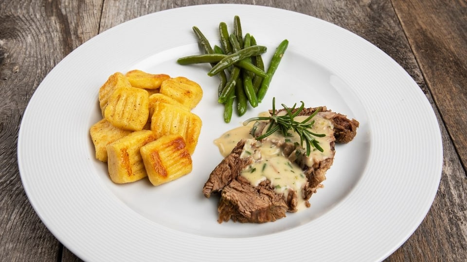 Siedfleisch in Tranchen schneiden und auf vorgewärmte Teller anrichten. Mit Kräutersauce nappieren und einem Petersilienbouquet belegen. Kartoffel-Gnocchi und Bohnen dazu anrichten.
