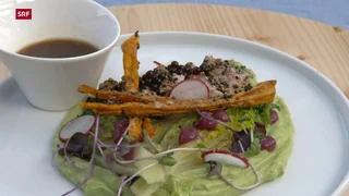 Nicolas verwöhnt seine Gäste mit einem Brät-Cordon-Bleu im Rucolabeet, Brathärdöpfeli, Gemüse und Joghurt-Kräuterdip