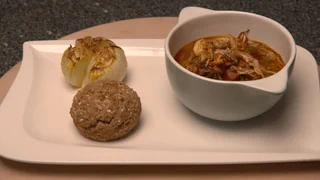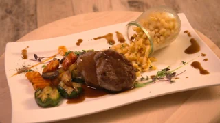 Peter verwöhnt seine Gäste mit Kalbshaxen Lorbeergeschmort mit Cassis-Perlzwiebeln und überbackenen Maisgnocchi
