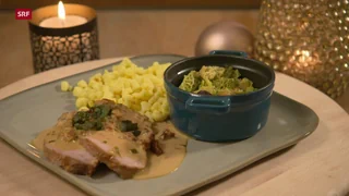 Romy punktet bei ihren Gästen mit Schweinsbraten an Madeira-Rahmsauce, Quarkknöpfli und Wirz-Rüebli-Gemüse.
