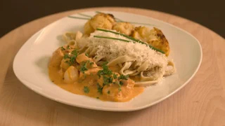 Ramona kocht für ihre Gäste Gersten-Pasta mit zartem Jäger-Poulet-Geschnetzeltem und überbackenem Blumenkohl.