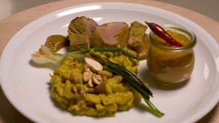 Alfons punktet bei seinen Gästen mit Indie-Knöpfli mit Masala-Sauce, Schweinefilet Tandoori-Art & Mango-Papaya Chutney