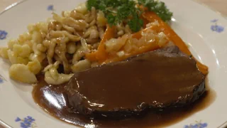 Sascha überzeugt seine Gäste mit einem Rindsbraten im Rotweinsud, hausgemachten Spätzli und glasierten Rüebli.