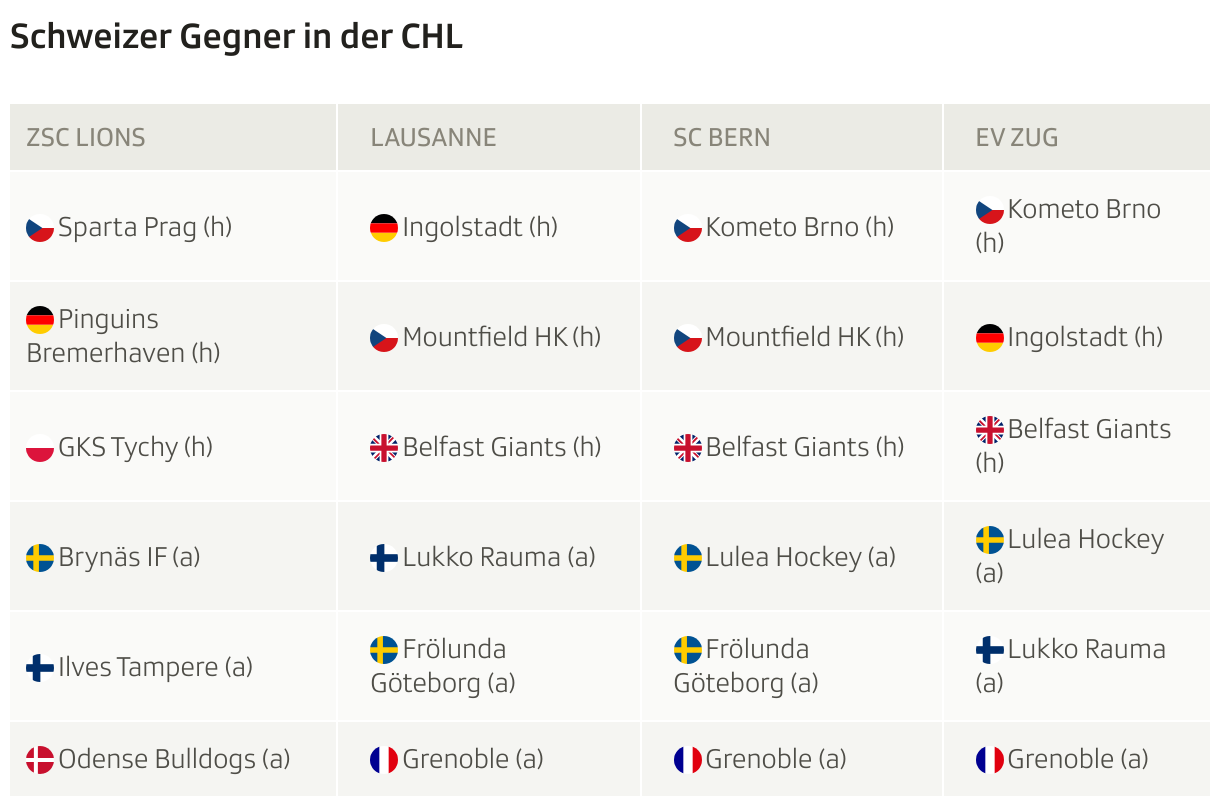 Keines dieser sechs Teams bekommt es mit den übrigen Schweizer Vertretern zu tun. Playoff-Finalist Lausanne, der SCB und Zug haben auf dem Weg in die K.o.-Phase teilweise aber die selben Gegner vor der Brust. So duelliert sich das Trio sowohl mit den Belfast Giants (GBR) als auch Grenoble (FRA).