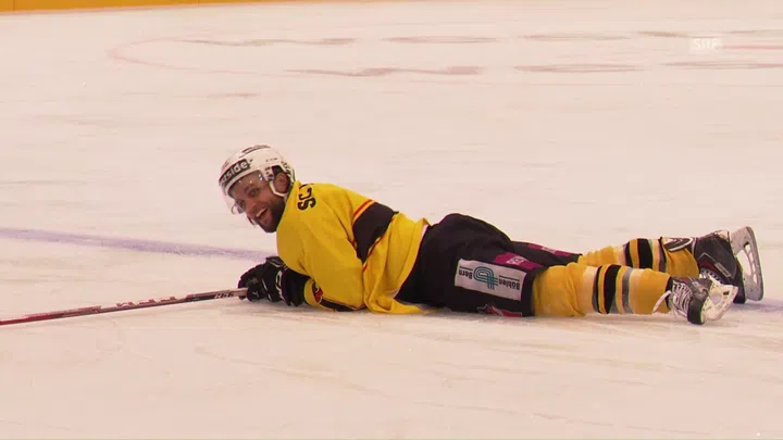Da schien jemand noch nicht ganz wach am Tag nach dem 1:0-Sieg über Lugano: Im Training stürzte Siegtorschütze Thomas Rüfenacht über seine eigenen Schlittschuhe, konnte aber über sein Missgeschick schmunzeln.