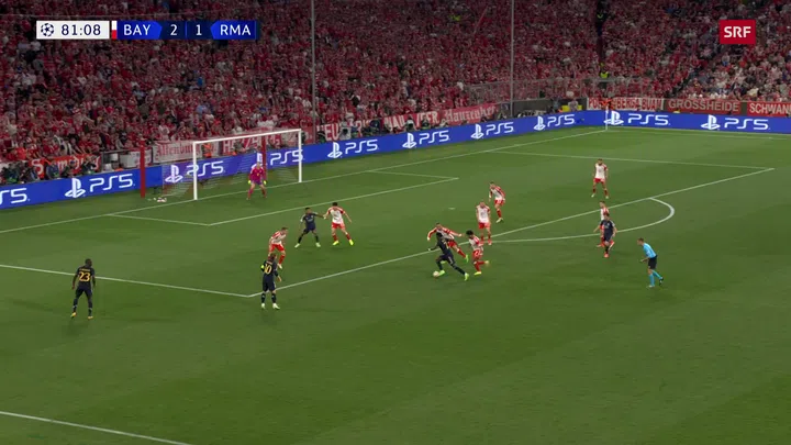 Nach der ersten Sturm-und-Drang-Phase der Bayern gestaltete sich das Geschehen ausgeglichener. Und in der 23. Minute hatte Reals Stratege Toni Kroos einen Geistesblitz: Vinicius zog Kim aus der Viererkette heraus und sprintete in Richtung Tor. Kroos lancierte den Stürmer, der vor Manuel Neuer eiskalt blieb und gekonnt einschob. So schön der Pass von Kroos war, so überraschend kam Reals Führung.