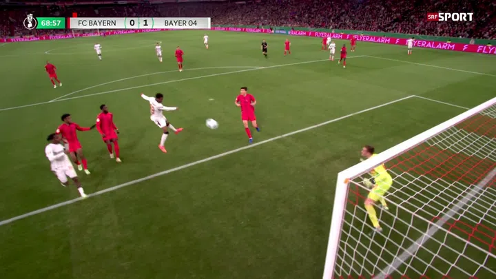 Die letztlich wohl spielentscheidende Szene hatte sich jedoch bereits nach 17 Minuten ereignet, als der Leverkusener Jeremie Frimpong nach einem Zuspiel in die Tiefe von Manuel Neuer umgerannt wurde. Der Goalie der Bayern erhielt dafür folgerichtig die rote Karte – seine erste im Alter von 38 Jahren und nach über 850 Profispielen.