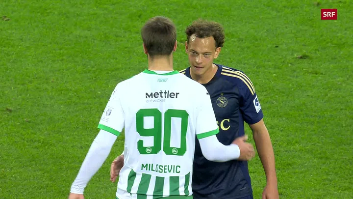 - 81. Minute: FCSG-Verteidiger Hugo Vandermersch sieht nach seinem zweiten unglücklichen Einsteigen die zweite gelbe Karte – vorerst aber nicht mehr. Auf Hinweis der Genfer wirft Schiedsrichter Stefan Horisberger einen prüfenden Blick in sein Büchlein und zückt doch noch den roten Karton.