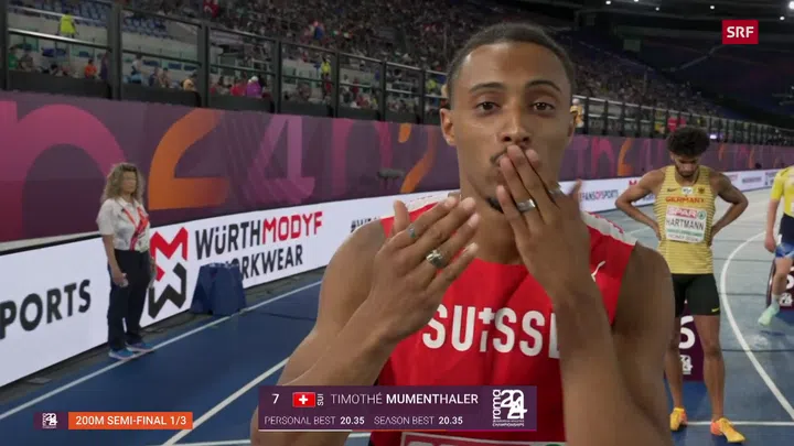 Über die halbe Bahnrunde meldeten gleich 3 Schweizer Ambitionen auf einen Final-Einzug an. Timothé Mumenthaler zeigte dabei gleich im 1. Heat seine Schnelligkeit. Der Genfer musste einzig dem Deutschen Rekordhalter Joshua Hartmann – und dies lediglich um 2 Tausendstel – den Vortritt lassen und schaffte in einer Zeit von 20,38 Sekunden den direkten Sprung in die Medaillenentscheidung.