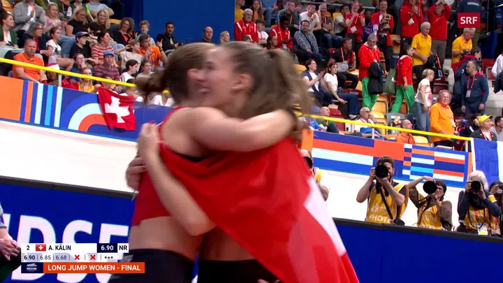 Wenige Minuten nach Moser durfte auch Zimmerkollegin Annik Kälin jubeln. Die Schweizer Mehrkämpferin, die in Apeldoorn im Spezial-Weitsprung antrat, sicherte sich mit 6,90 Metern die Silbermedaille. Die Weite, die neuen Schweizer Rekord darstellt, sprang Kälin schon in ihrem 1. Versuch. Nur die Italienerin Larissa Iapichino setzte sich mit 6,94 Metern noch vor Kälin. «Es war ein Mega-Wettkampf», freute sich Kälin. «Es war cool, gleich mit den 6,90 m zu starten, und dann inmitten einer guten Konkurrenz so gute Sprünge zu zeigen.»