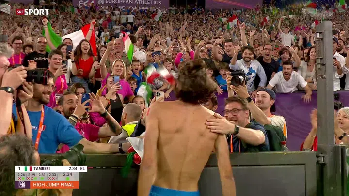 Doch der 32-Jährige dachte noch nicht daran, aufzuhören. Nach zwei missglückten Versuchen über 2,33 m liess er sich die Latte auf 2,34 m legen – und übersprang diese im ersten Versuch. Tamberi liess sich feiern, zog Sprungfedern aus seinen Ersatzschuhen und brachte die Stimmung im grossen Rund zum Kochen. Als Bonus übersprang er schliesslich noch 2,37 m und stellte damit ganz nebenher noch einen EM-Rekord auf.