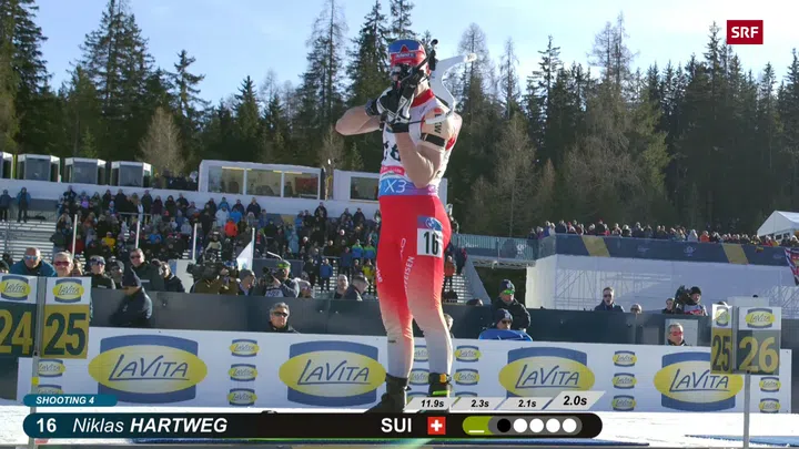 Damit wurde ihm direkt eine Strafminute aufgebrummt. Weil die läuferische Leistung stark war, reichte es Hartweg trotzdem noch auf Schlussrang 5. Auf das Podest und Bronzegewinner Quentin Fillon Maillet fehlten am Ende 16 Sekunden. Mit einem Fehlschuss weniger wäre die erste Schweizer Medaille Tatsache gewesen.