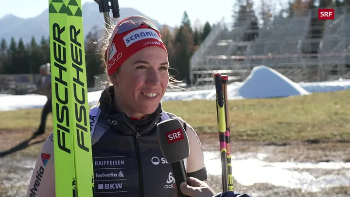 Nicht einmal der helle Sonnenschein in Lenzerheide kam gegen das strahlende Lächeln von Biathletin Lena Häcki-Gross an. Es verschwand nur ganz kurz, als ihr während dem SRF-Interview die Ski entglitten und sie diese noch knapp auffangen konnte. Sofort war das Lachen wieder zurück.