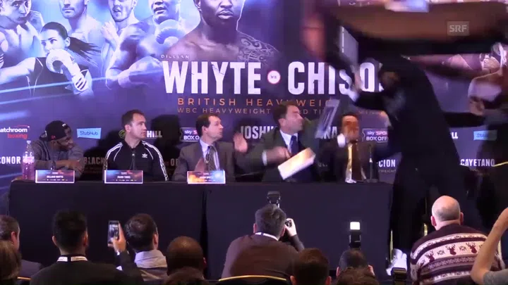 «Badboy» Dereck Chisora hat dem ganzen nun aber eine neue Dimension gegeben. Nach einem Wortwechsel mit Dillian Whyte verlor der 32-Jährige vollends die Fassung, schnappte sich den Tisch, an dem er sass, und warf diesen kurzerhand auf seinen Gegner.
