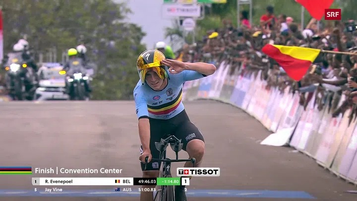 - Remco Evenepoel holt sich mit einer Machtdemonstration zum dritten Mal in Folge WM-Gold im Zeitfahren.