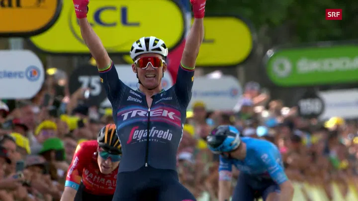 - Der Fahrer aus dem Trek-Team setzt sich in St-Étienne in einem Dreiersprint vor Fred Wright (Bahrain-Victorious) und Hugo Houle (Israel Premier-Tech) durch.