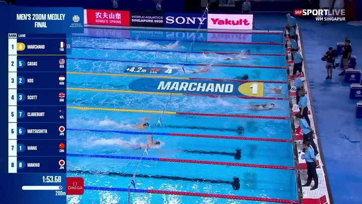 Einen Tag nach seinem Fabel-Weltrekord im Halbfinal hat Léon Marchand an der WM in Singapur über 200 m Lagen nachgelegt. Der Franzose sicherte sich den Titel vor dem US-Amerikaner Shaine Casas und dem Ungarn Hubert Kos. Mit der Zeit von 1:53,68 Minuten unterbot der vierfache französische Olympiasieger den alten Weltrekord von Ryan Lochte erneut, blieb aber knapp eine Sekunde über seiner eigenen neuen Bestmarke vom Mittwoch.