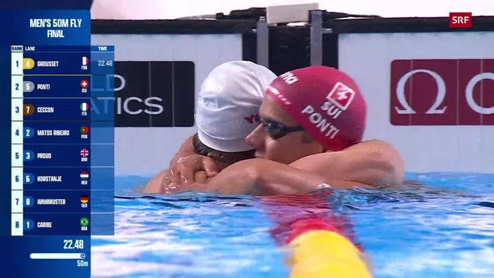 In den Vorläufen schwamm Maxime Grousset genau gleich schnell wie Noè Ponti (22,74 Sekunden). Im Halbfinal war der Franzose dann als Einziger schneller als der Tessiner (22,61 vs. 22,72). Und auch im Final der besten Acht war Grousset einen Tick besser als Ponti und schnappte dem Schweizer die Goldmedaille weg.