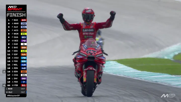Der Italiener Francesco Bagnaia hat den Sprint beim GP Malaysia in überzeugender Manier gewonnen. Auf dem Rundkurs in Sepang verwies der Ducati-Pilot die Spanier Alex Marquez und Pedro Acosta auf die weiteren Podestplätze. Fermin Aldeguer, der als Dritter über die Ziellinie gefahren war, wurde nachträglich wegen zu geringen Reifendrucks mit 8 Sekunden bestraft und rutschte auf Position 7 ab.