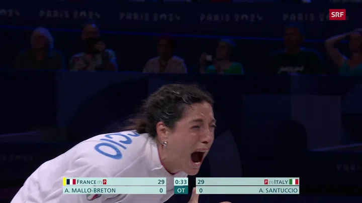 Das an Nummer 1 gesetzte Italien hat im emotionsgeladenen Teamfinal der Degenfechterinnen im Grand Palais gegen Frankreich hauchdünn mit 30:29 die Oberhand behalten. Die Entscheidung fiel erst in der Verlängerung, als Alberta Santuccio gegen Auriane Mallo-Breton den entscheidenden Treffer landete. Trotz der Unterstützung der vielen französischen Fans blieb dem Team aus der Gastgeber-Nation nur die Silbermedaille. Frankreich, das im Turnierverlauf die höher eingestuften Südkoreanerinnen und Polinnen ausgeschaltet hatte, gab eine 19:15-Führung preis. Polen sicherte sich mit einem ebenfalls knappen 32:31-Sieg über China noch Bronze.