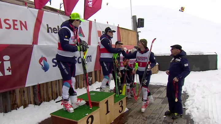 Nach dem Wettkampf der Männer liess sich der Bündner Sandro Simonet Gold umhängen. Der 22-Jährige, der vor einem Monat als Achter beim Weltcup-Slalom in Kranjska Gora überrascht hatte, verwies den Walliser Loïc Meillard um 22 Hundertstelsekunden auf Platz 2. Der Zentralschweizer Matthias Iten stand als Dritter auf dem Podest.