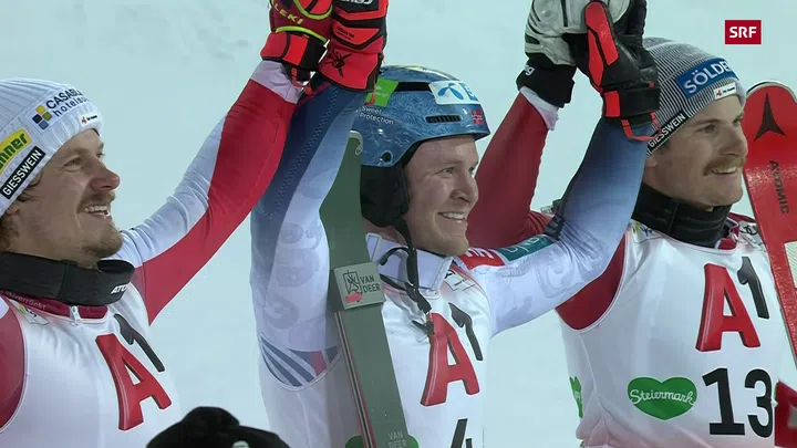 Viel Grund zur Freude am Fusse der Planai hatte auch das Heimpublikum. Mit Manuel Feller und Fabio Gstrein belegten nämlich zwei Österreicher die weiteren Plätze auf dem Podest. In den acht Slaloms zuvor in diesem Winter hatten die Österreicher die Top 3 stets verpasst. Gstrein machte in der Entscheidung vier Plätze gut, Feller sprang vom 4. auf den 2. Rang.
