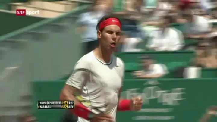 Nadal, der «Tennisfürst» von Monte Carlo, setzte sich gegen Philipp Kohlschreiber (De) nach 80 Minuten mit 6:2, 6:4 durch und steuert damit seinem 9. Turniersieg in Serie im Fürstentum Monaco entgegen. Im Viertelfinal wartet nun Grigor Dimitrov (Bul, ATP 34).