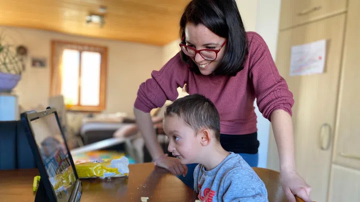 Bild 4 von 4. Bettina Scherrer macht jeden Tag Übungen mit ihrem fünfjährigen Sohn. Sie glaubt an sein Entwicklungspotenzial: «Er überrascht uns immer wieder.». Bildquelle: SRF.