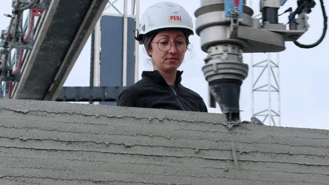 Aber es braucht nicht mehr viele: «Zu zweit kann man die Baustelle ganz gut managen», erklärt Lena Zimmer. Die junge Bauingenieurin arbeitet seit ihrem Masterstudium als Projektleiterin seit drei Jahren bei Peri 3D Construction.