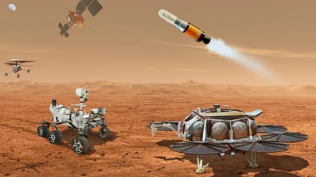 Der Rover selbst hat einige Messinstrumente an Bord. Kameras natürlich, aber auch Massenspektrometer oder Röntgengeräte für chemische Untersuchungen. – So kann der Rover die Proben direkt vor Ort untersuchen. Nur bleiben noch viele Fragen offen, Fragen, die sich nur in Laboren auf der Erde klären lassen. Deshalb war der Plan die Proben bis 2035 auf die Erde zu holen.